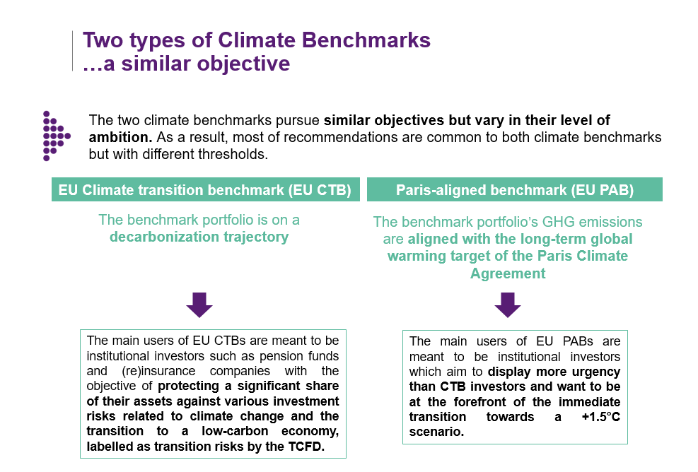 Institutional investors, pension funds, benchmark administrators, but not only! The application scope goes far beyond benchmarks in practice. With these CTB and PAB criteria, the European Commission intends to provide all investors with a ready-to-use tool for asset allocation in order to align their portfolio with the Paris Agreement.