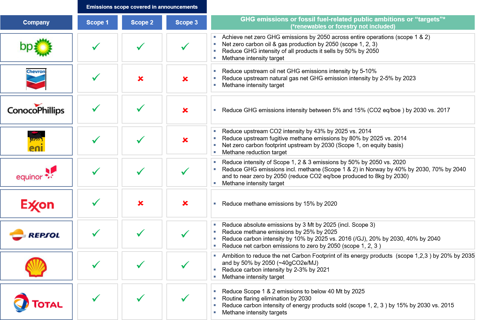 Overall, it is challenging to compare O&G companies’ because their ambitions often differ in their terminology, methodologies (perimeters & calculation methodology) and timeframes (as shown in the recap table below). One welcomes the growing number of O&G companies with announcements covering scope 3 emissions. Only Repsol and BP have announced net zero emissions ambitions. Whereas one can only applaud such bold statements, their underneath and feasibility must be investigated to prevent “net zero” to become a new buzzword. Sight must not be lost of the strategic decisions made for the next 5 to 10 years (incl. CAPEX and R&D expenditures).