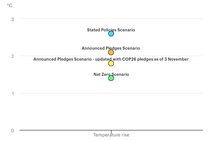 According to the latest updated analysis conducted by the International energy agency (IEA)[iv] of the all the new countries’ pledges to reach net zero emission, including India pledged to hit net zero emissions by 2070, the 100 countries promising to cut emissions of methane by 30% by 2030, the end of deforestation by 2030 and others, COP26 climate pledges could help limit global warming to 1.8 °C, still far from the 1.5°C targeted.