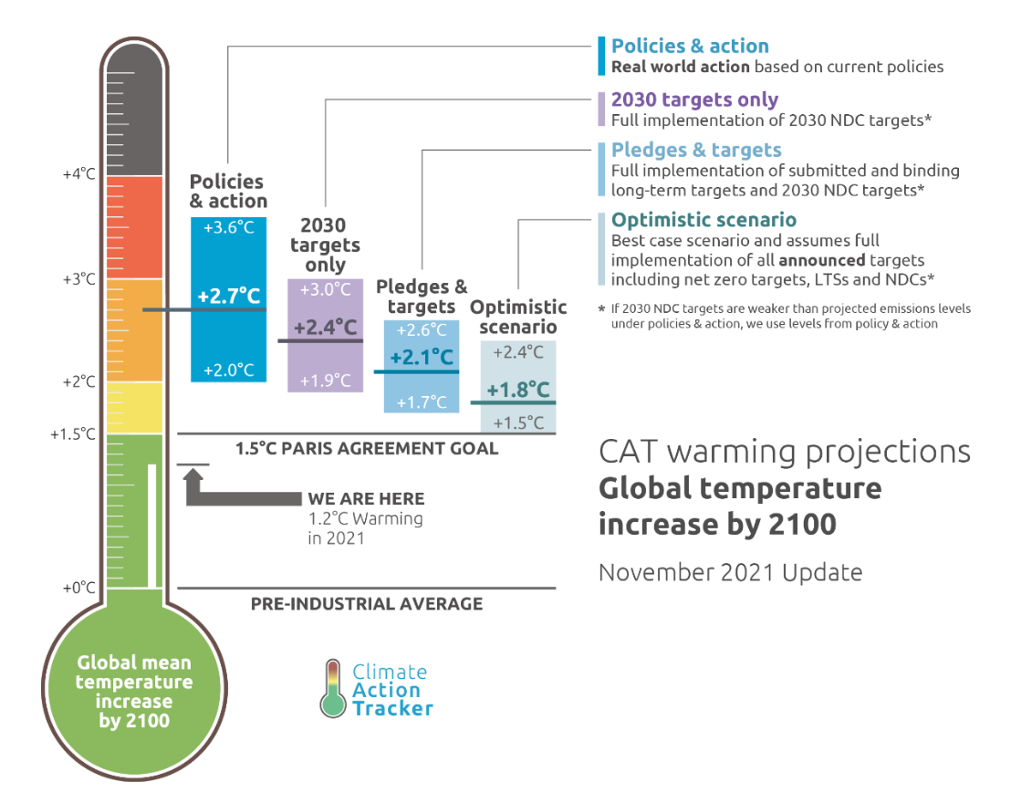 On its side, Climate Action Tracker[19] estimated that with 2030 pledges alone – without longer term targets – the world was on track for a 2.4°C warming by 2100. “The vast majority of 2030 actions and targets are inconsistent with net zero goals: there’s a nearly one-degree gap between government current policies and their net zero goals” said Bill Hare, CEO of Climate Analytics, a CAT partner organisation.
