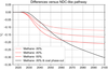Figure 3 - Mitigation benefit from methane emission cuts (red lines) and additional climate benefit of phasing out coal by 2040 on top of a 30% methane reduction pledge (black).