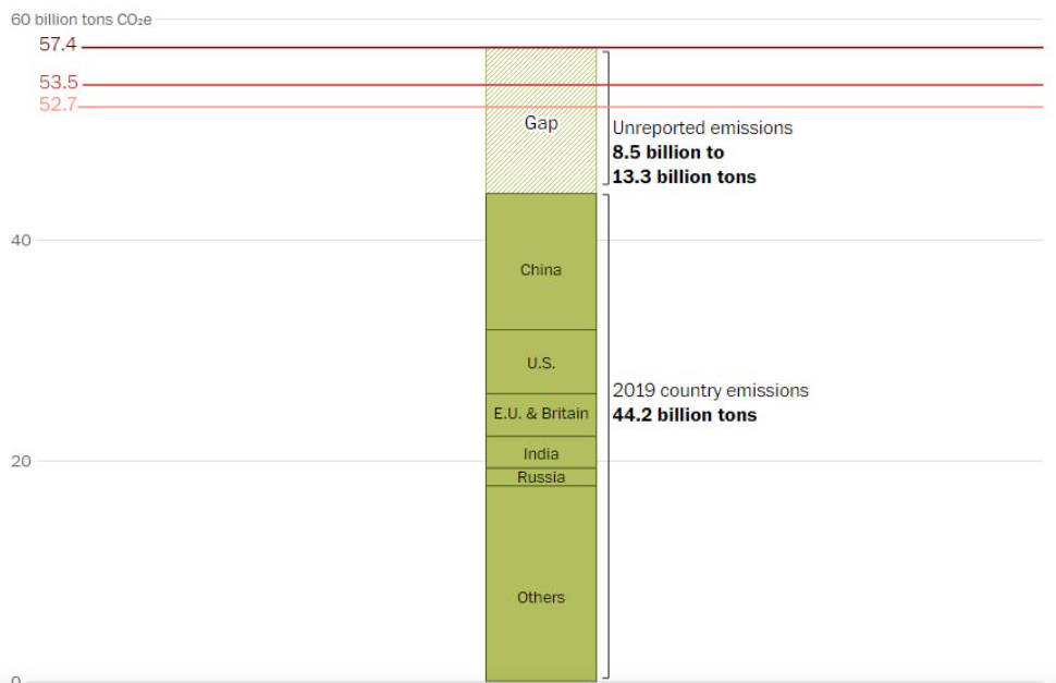 Meanwhile, an investigation from the Washington Post[21] revealed that the CO2 emissions reported by the countries to the UN are largely underestimated. Between 8.5 (more than the United States yearly emission) to 13.3 (almost equivalent to Chinese yearly emission) billion tons of CO2 are omitted as a result of accounting twists.