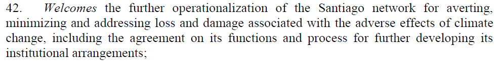 The Santiago network[33] developed during the COP25 aimed at catalysing technical assistance for the implementation of relevant approaches for averting, minimize and addressing Loss and Damage in developing countries. But again, no mentions of financing reparations have been included by the network.