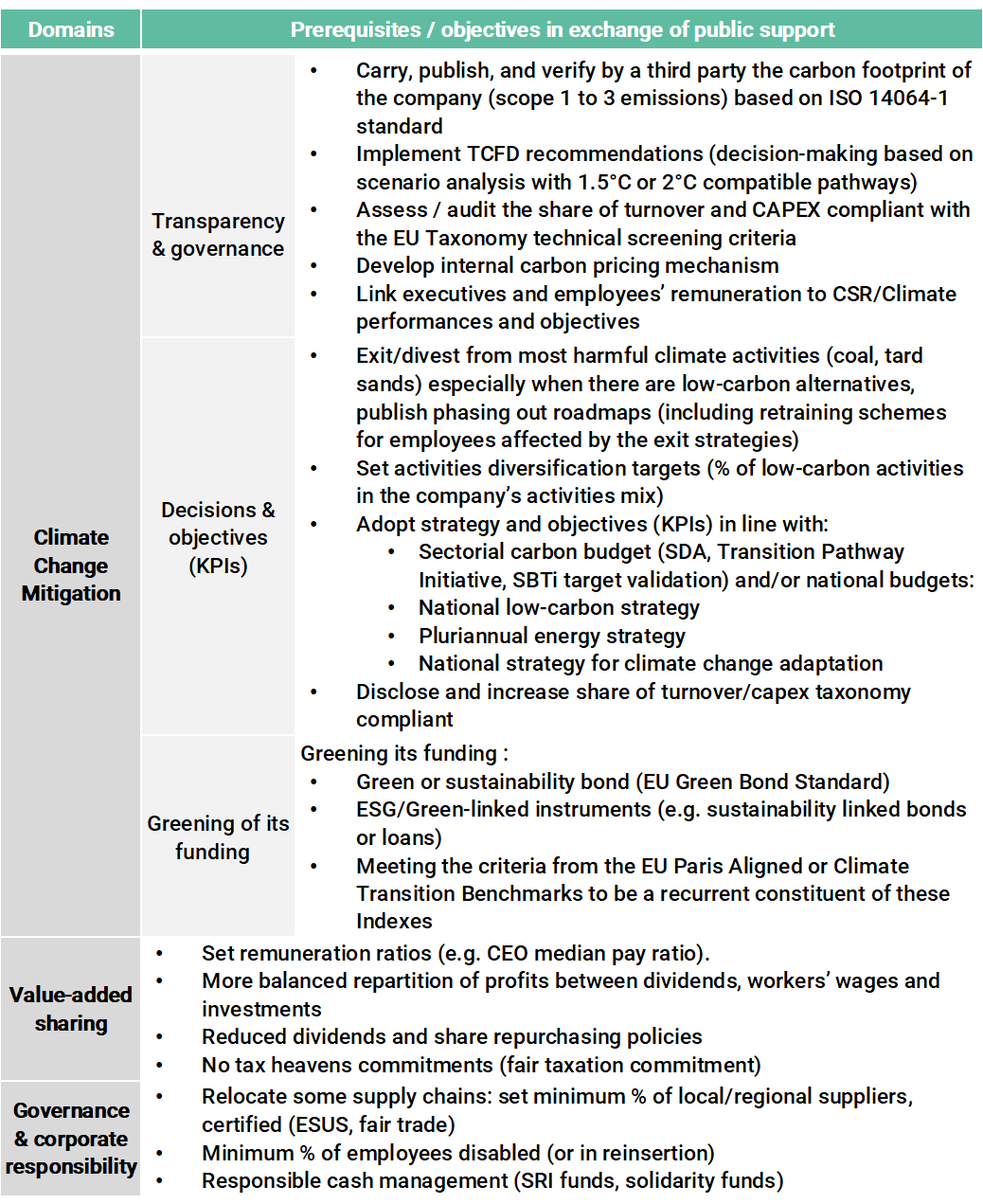 The pressure from public opinion lead to a mounting debate about the “conditionality” of public aids aiming at safeguarding businesses from bankruptcy and avoiding massive unemployment. Calls are becoming louder to ringfence funds and impose climate, social and value-added sharing (dividend, pay ratio) prerequisites in exchange of public support.