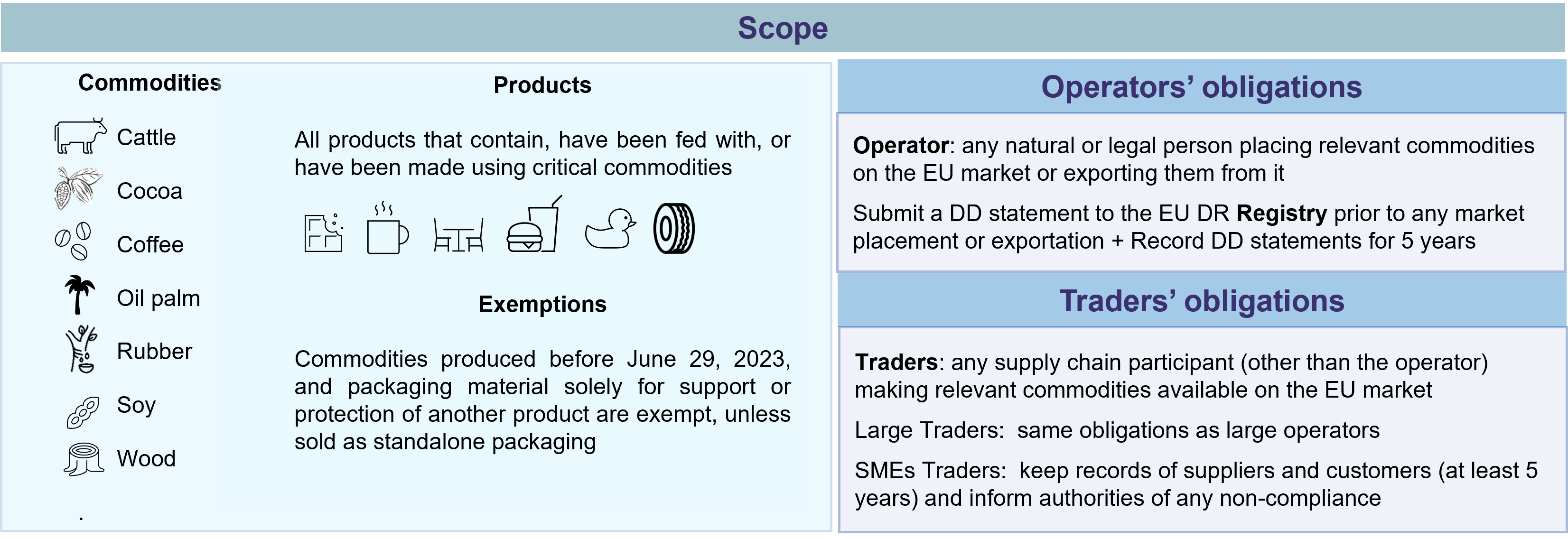 All operators placing commodities or products covered by the EU DR (see below) on the EU market or exporting from it are in scope. Applying uniformly to EU and non-EU operators, the regulation was designed to close the loopholes in voluntary schemes and prevent free riders in supply chains. Covering seven key deforestation-related commodities and derived products, it should cover more than 90% of EU-driven deforestation according to the EU Commission.