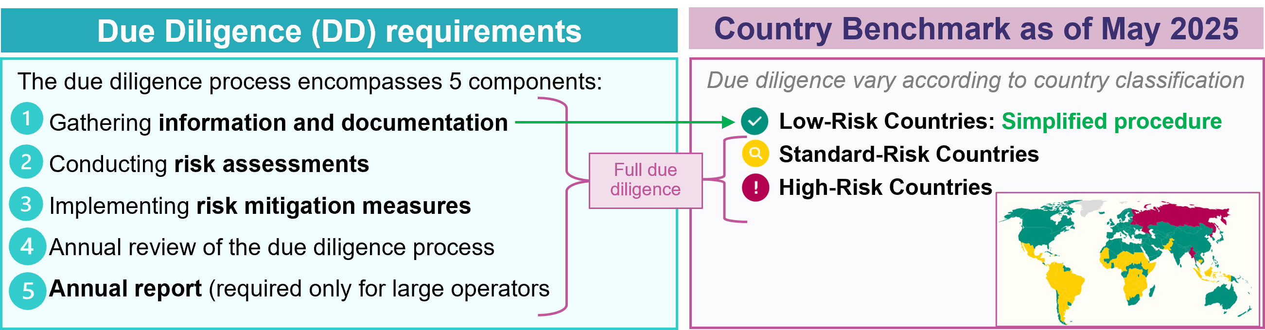 - the level of due diligence checks to be performed at the level of the operator: low-risk countries require only gathering of data and information (1 out of the 5 due diligence requirements provisioned by the EUDR);
