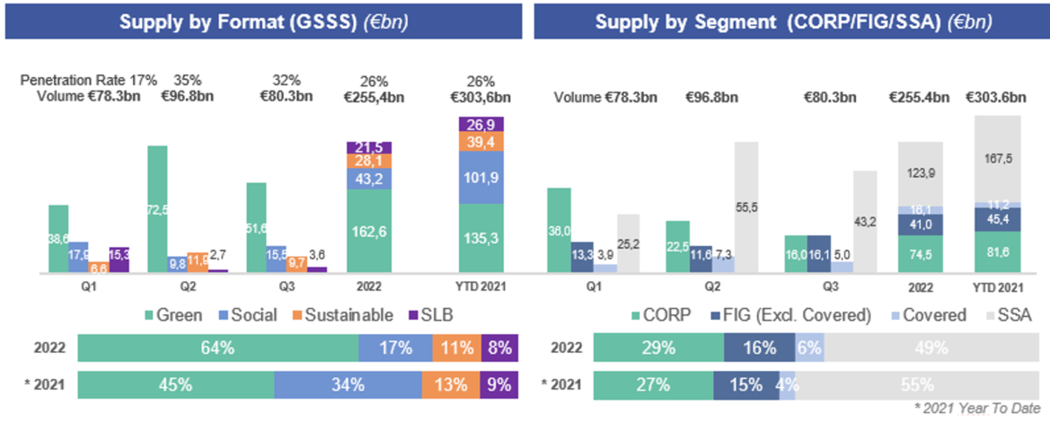 Green supply is up: supply amounts to EUR 162bn. These have witnessed a 19% increase (+ EUR 27bn) vs. 2021 YTD. More importantly, green bond issuance account for 85% of Financial Institutions Group’s (FIG) total GSSS issuances, 62% of corporates’ and for 55% of SSA’s, whilst one out of 2 inaugural GSSS is green. Green bonds supply equally accounts for 64% of the total GSSS supply, against 45% in 2021 YTD.