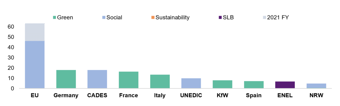 Most of this noteworthy supply increase differential, when compared to the previous year, is attributable to the European Union (EU) and the European Investment Bank (EIB)’s recent acceleration in terms of green bond issuance, under the Commission’s NextGenerationEU program and the EIB’s new issuance strategy.