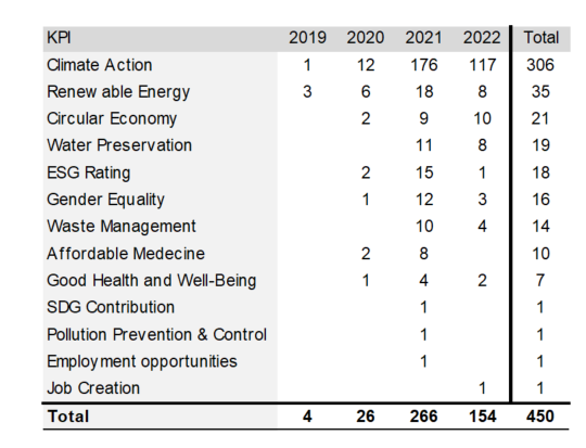 The format keeps developing, with over half of corporates inaugural GSSS bonds issued under the SLB format. The format is increasingly being use across sectors (cf. table 3&4) and by type of sustainability performance targets (SPTs) being used, as outlined by a report published in September by Fitch.[5]