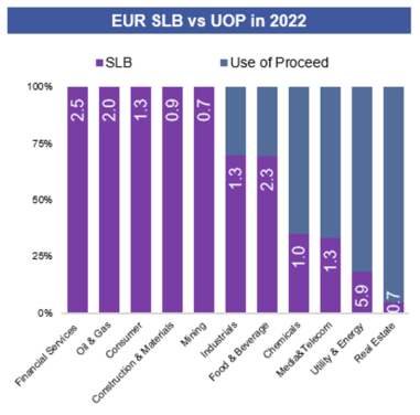 There has been a relative slowdown in terms of volumes: SLB Euro issuance is down by 20% vs. 2021 but represents a stable 30% share of Corporate GSSS issuance (vs. 70% on Use of Proceeds Bonds).