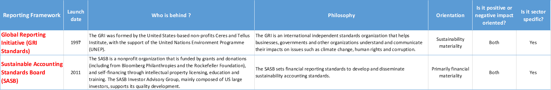 - Main sustainability reporting standards currently used by corporates and investors (GRI Standards and SASB)