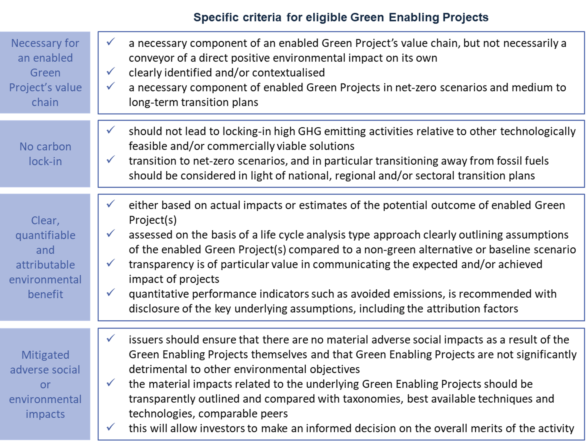 In the guidance document published by ICMA, Green Enabling Projects are subject to all the criteria (to be deemed eligible) described below: