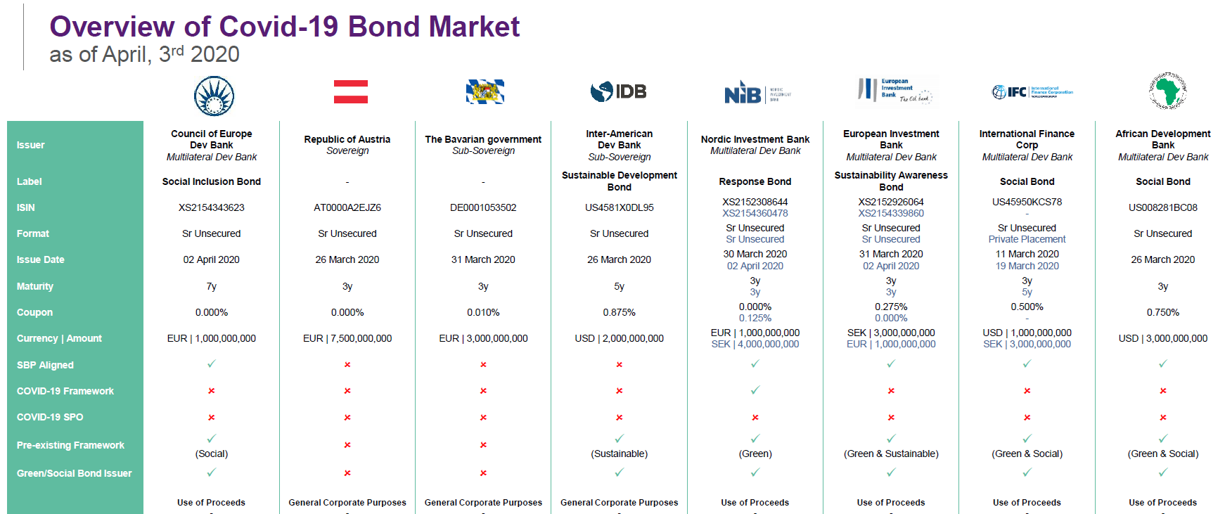 On the other hand, lenders/ borrowers, mostly SSAs, have started issuing Covid-19 related bonds, some of which under the Social Bond format. The International Finance Corporation (IFC), the Bavarian Government, the Republic of Austria, the Inter-American Development Bank (IADB, or IDB), the African Development Bank (AfDB), the Nordic Investment Bank (NIB), the European Investment Bank (EIB), and the Council of Europe Development Bank (CoE, or CEB) are amongst the issuers of such bonds.