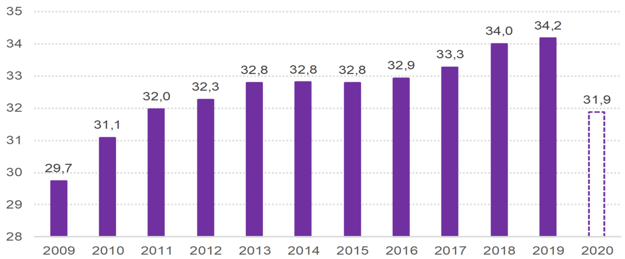Despite the decline observed in 2020 in an unprecedented context of a global health crisis, the levels of worldwide CO2 emissions still represent a considerable challenge in the fight against climate change. Indeed, CO2 emissions dropping by some 6% in 2020 according to preliminary estimates cannot overshadow the upward trend observed since 2009 (see chart below). This trend must itself be analyzed in light of the trajectory of carbon emissions necessary to achieve the objectives set by the Paris Agreement of December 2015. Let’s recall this agreement sets the objectives of “holding the increase in the global average temperature to well below 2° Celsius above pre-industrial levels and pursuing efforts to limit the temperature increase to 1.5° Celsius above pre-industrial levels”. Such targets entail reaching carbon emissions neutrality around 2050 followed by negative emissions thereafter.