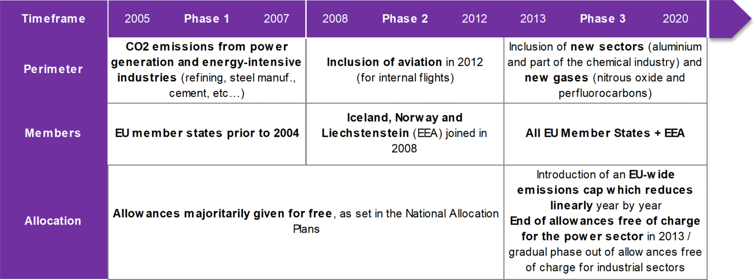 Since inception in 2005, the EU ETS has undergone various transformations aimed at enlarging the scope of emissions covered and favoring the emergence of carbon price signals incentivizing the use of the least CO2-intensive technologies and processes, this through: