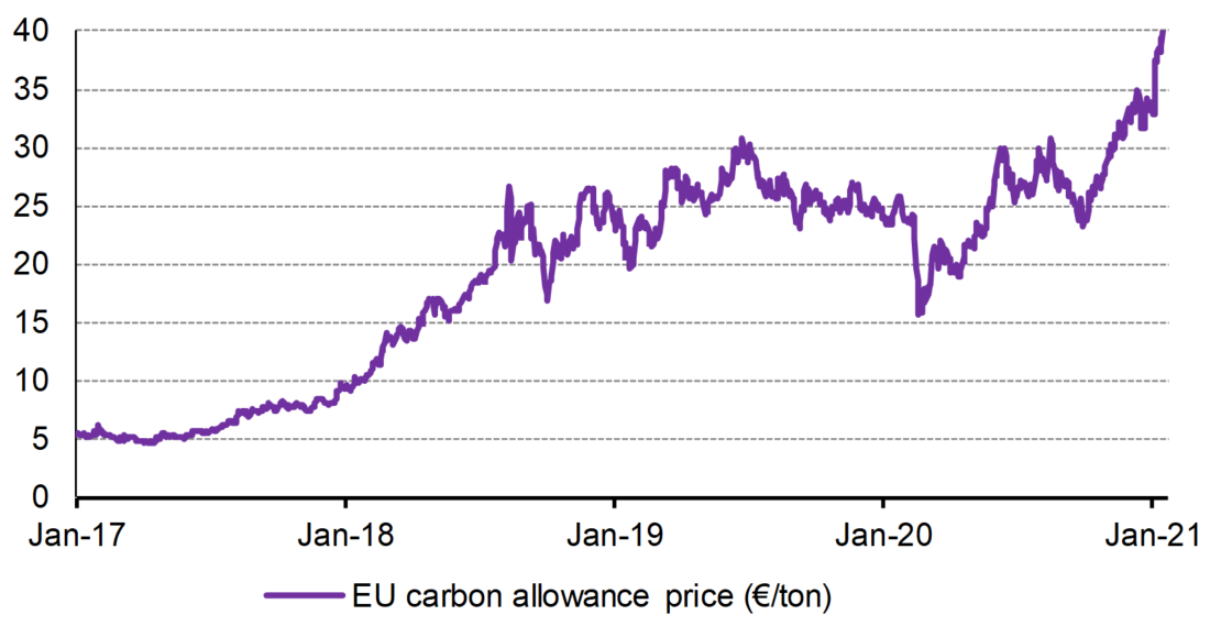 One may therefore expect a growing scarcity of available emission allowances and an extension of the scheme to other carbon-intensive sectors (road transport) from forthcoming legislative proposals from the EC. We believe they are inevitable in order to allow the EU to take a step forward in its decarbonization journey, this by promoting, via relevant carbon price signals, the transformation of sectors such as transport and industry which are still very dependent on fossil fuels. These elements are the basis of the anticipation — now consensual — of a markedly upward trajectory in carbon allowance prices in Europe until 2030 (from € 40/t today to possibly €60- €90/t in 10 years from now).