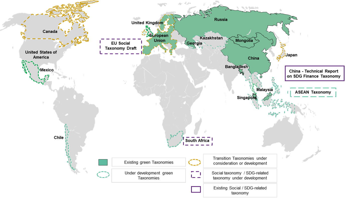 * This study was mostly conducted in the first half of 2021. Numerous other initiatives have emerged since then and announcements keep growing. Therefore, a number of taxonomies projects are not covered in this study, or not in details. For instance, the Korean Taxonomies, but also initiatives from Sri Lanka, Indonesia, Vietnam, Philippines, Thailand, Colombia or New Zealand.