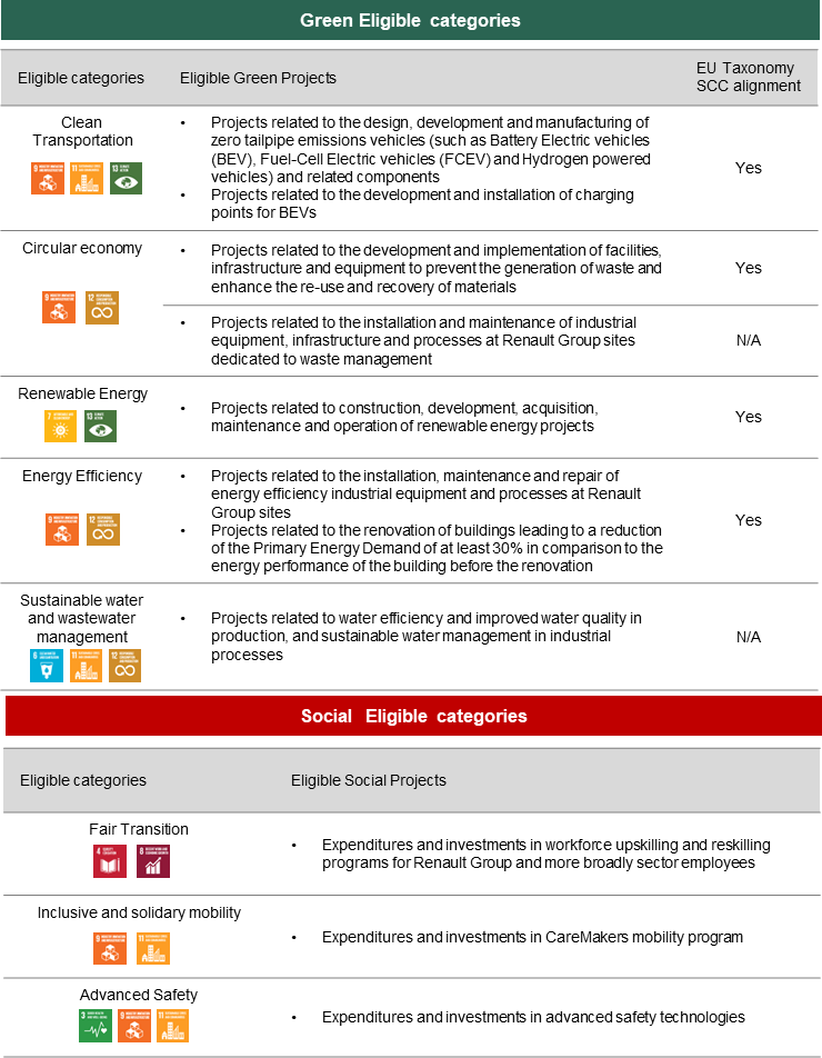 In order to fully incorporate this vision into the group's financial strategy, Renault published its Sustainable Bond Framework[2] in 2023, with the support of Natixis as ESG Structuring Advisor . The Framework includes both green and social categories to accurately reflect the group's strategy, and received a positive Second Party Opinion from Moody’s [3] with an SQS2 Sustainability Quality Score (very good) level of assessment.