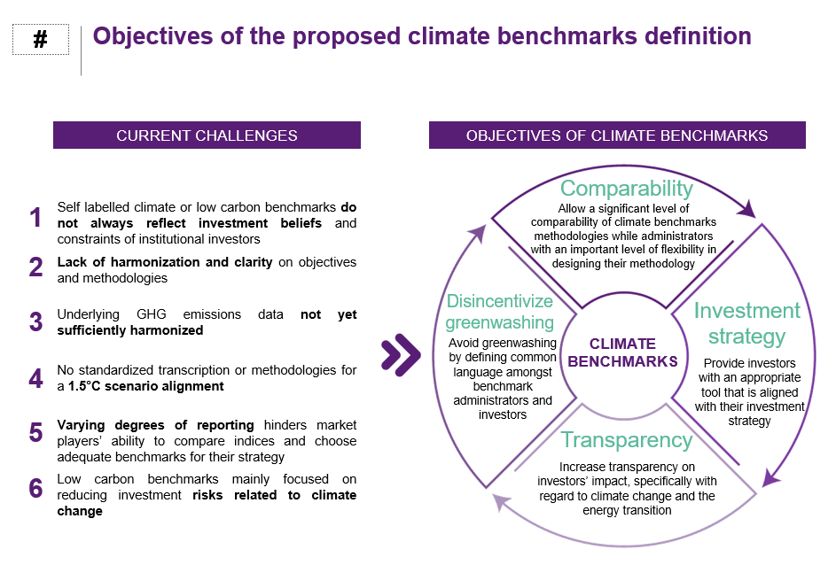 Current climate benchmarks do not always reflect investment beliefs and constraints of institutional investors, they also lack harmonization and clarity on objectives and methodologies. The EU TEG report published in September 2019 provides the list of recommendations for minimum standards, which will constitute a common language for investors.