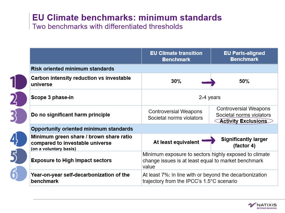 A list of 7 criteria are defined, including notably i/ carbon reduction compared to the investable universe, ii/ minimum exposure to high impact sectors, iii/ year-on-year self-decarbonization. The criteria apply both to CTB and PAB but the thresholds are different for some of them. The main difference between the EU approach and current market practices is that standards are considered at portfolio level (weighted average), and not on a single-name basis.