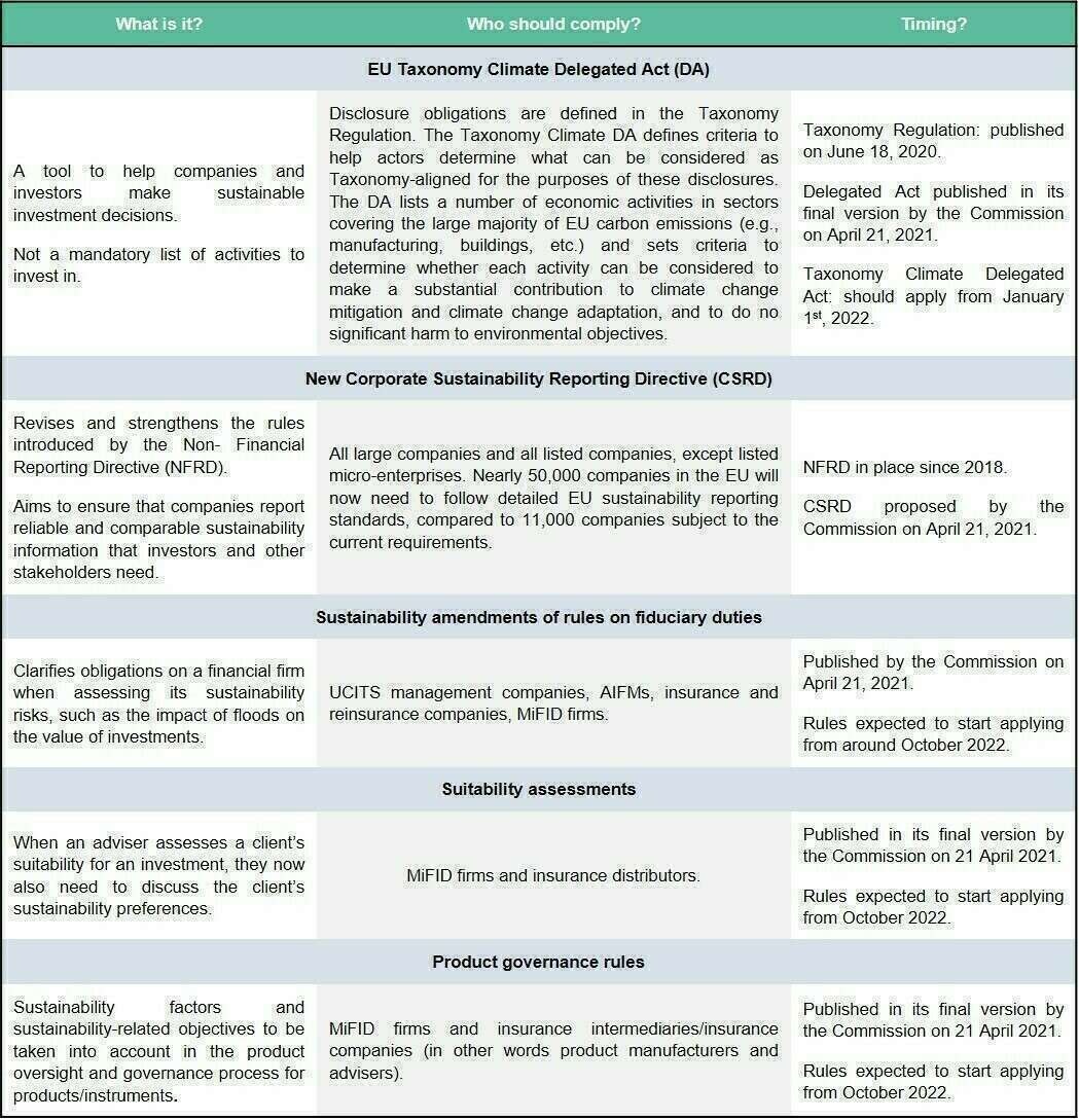 - On fiduciary duties: amendments clarify the obligations of a financial firm when assessing its sustainability risks, such as the impact of floods on the value of investments.