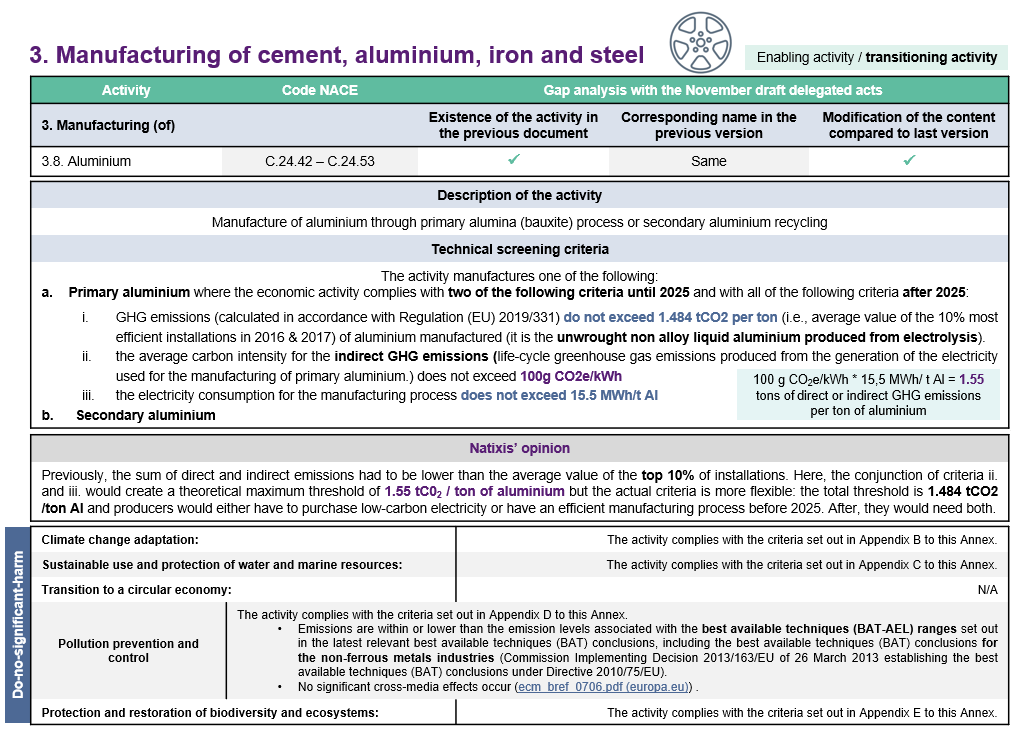 Compared to the draft release in November 2020, the final version of the Climate Delegated Acts has had some criteria eased. These included the criteria to produce hydrogen [5], and the construction [6] and acquisition [7] of building. For electricity generation from hydropower, the mention “electricity generation facility is a run-of river plant and does not have an artificial reservoir” has been added. For some specific manufacture activities [8], the use of EU emissions trading scheme (ETS) benchmarks [9] is confirmed, in the absence of objective alternatives to ensure environmental ambition. However, the main points to be highlighted remain the removal of the criteria for agriculture [10] and natural gas [11] as an energy source, while nuclear activities remain out of this set of criteria. As a reminder, agriculture and natural gas were included in the November draft version.