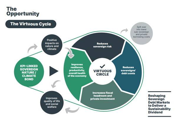 The Hub has based its approach on a “virtuous circle” (see diagram below) created through structural reforms, sustainable policies’ implementation, and financing with KPI-linked sovereign nature bond or climate bond. To such end, one expects that the Hub will identify hurdles in the issuance of SLB by sovereigns and will propose remedies per type of profiles – even though the audience is to be clarified.